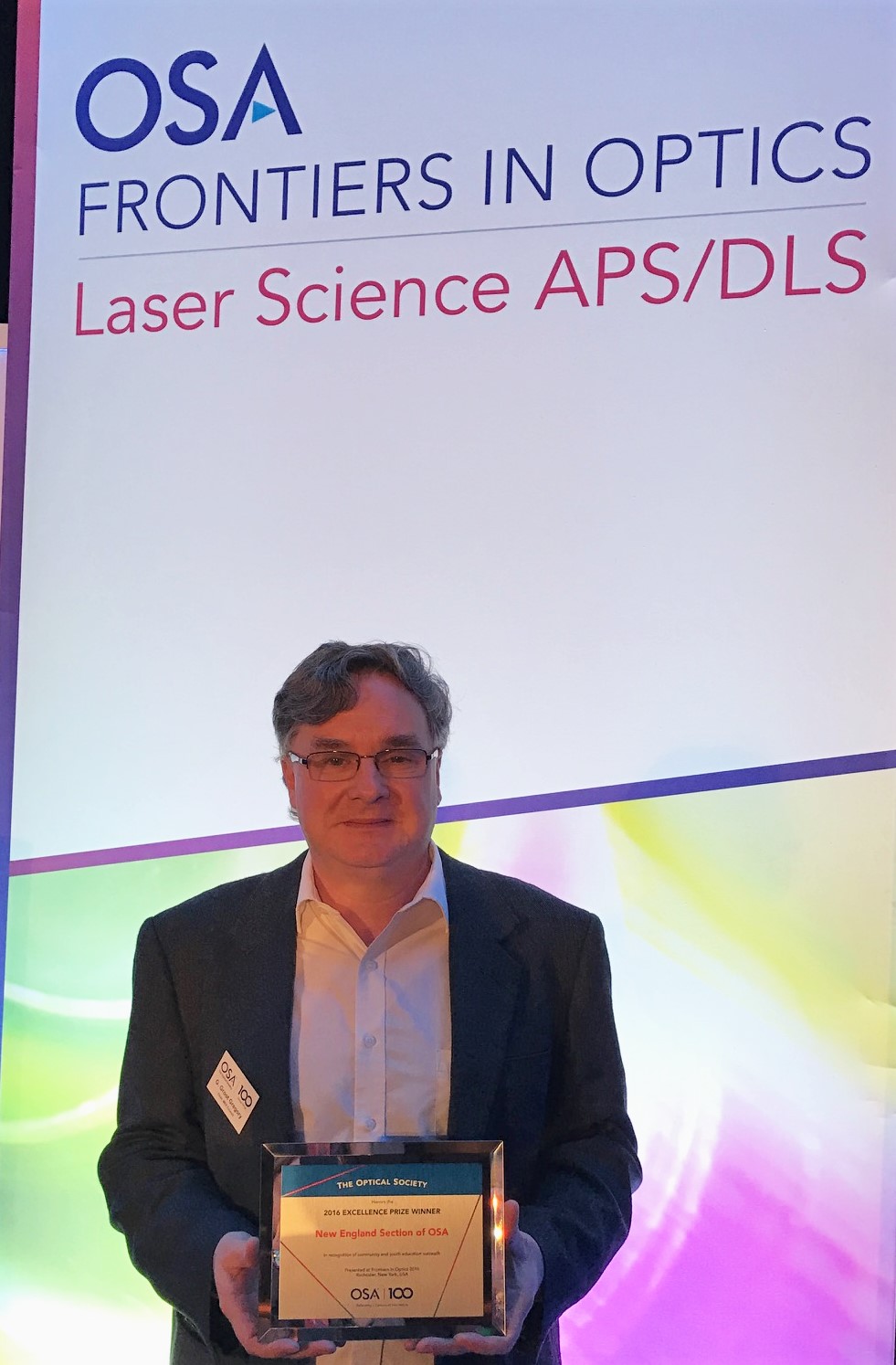 The Optical Society (OSA) awarded the New England Section an Excellence Award for its 2016 educational outreach activities. The award was presented in Rochester at the OSA Frontiers in Optics meeting during the Oct 19th plenary session.