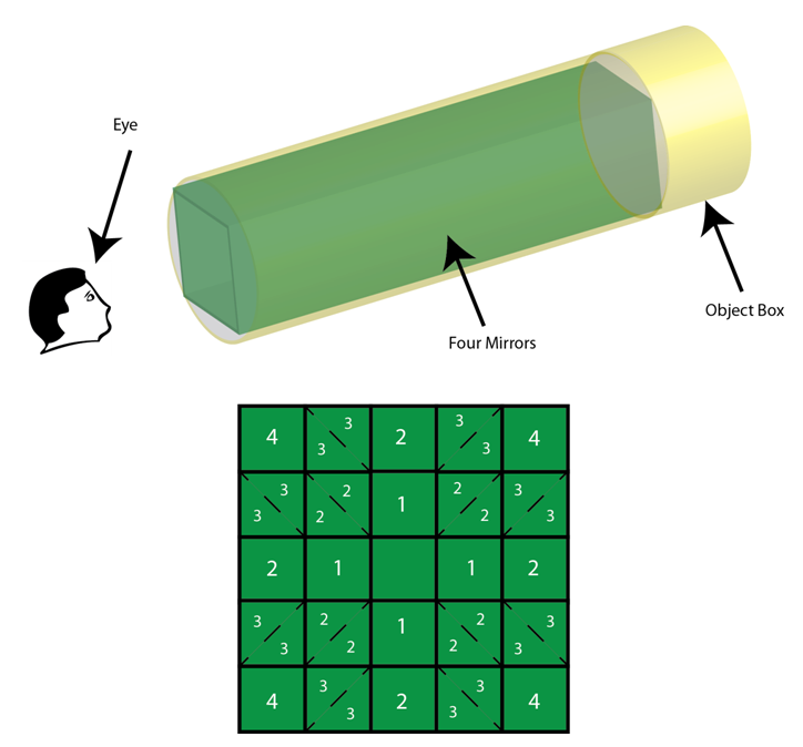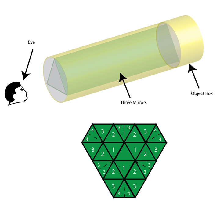 The following illustrations show how the images are multiplied for three and four mirror kaleidoscopes.
